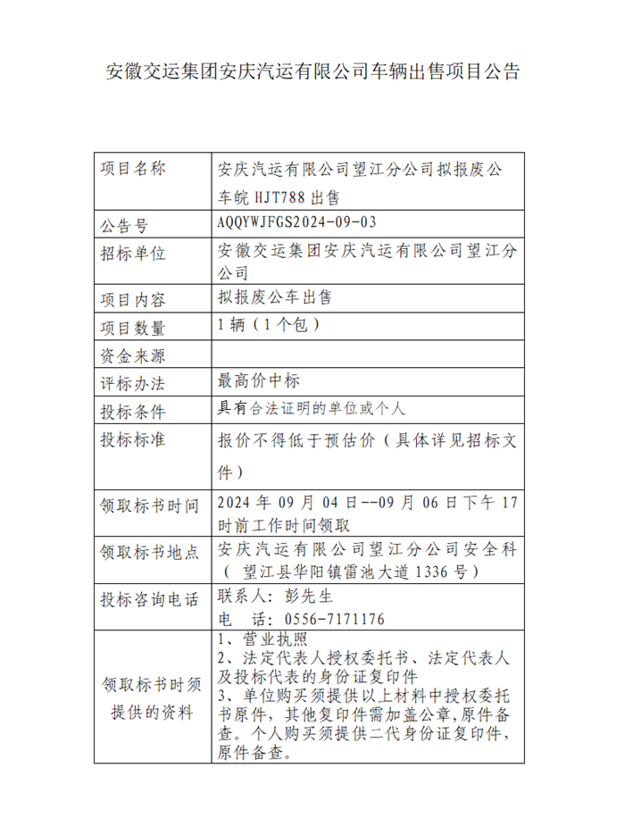 望江分公司擬報(bào)廢公車皖HJT788出售項(xiàng)目公告