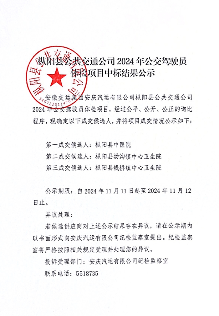 樅陽公交駕駛員2024年體檢項目中標(biāo)公告
